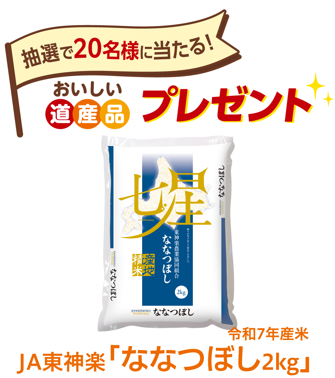 大雪山の伏流水で育ったJA東神楽自慢の米「ななつぼし」。「つや」「粘り」「甘み」のバランスが抜群で、冷めてもおいしさが長持ちします。