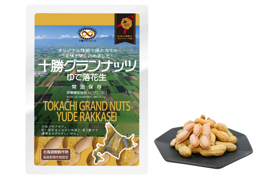 十勝・芽室産落花生を使用。オリジナル技術で採れたてのうま味を閉じ込めました。大粒でホクホクした食感は食べ始めたらとまりません。香り豊かで濃厚なみずみずしい甘みが特徴です。北のハイグレード食品にも選ばれた逸品をぜひ。